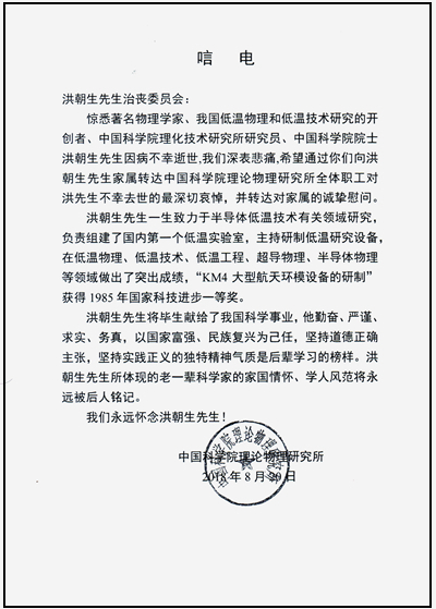 中國科學院理論物理研究所唁電