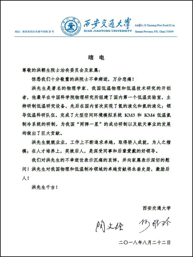 西安交通大學陶文銓院士、何雅玲院士發來唁電